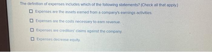 Expenses are the costs necessary to earn revenue Expenses decrease equity Which of the statements below define an asset. An amount owned Resources with future benefits Controlled by the business Meltons Door Company pays rent on the building facilities of 5000 on May 1. Given the statements below choose the most accurate definition of dividends.